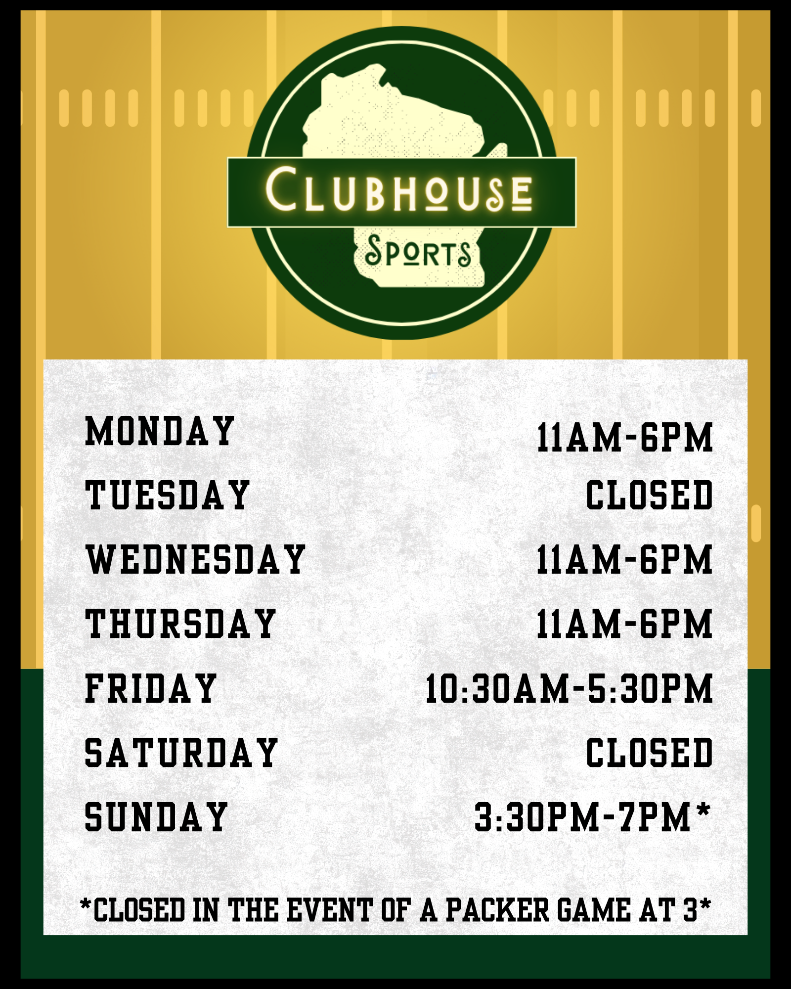 We are open on Sundays for those post or pre-victory purchases! However, there will be sporadic closures due to some shows and signings taking place on Sundays. Additionally, when the Packers play in the 3:00 slot, we will close.